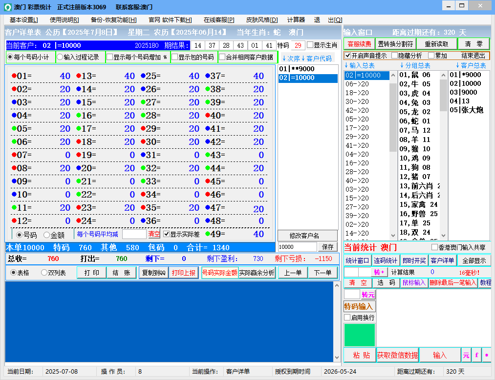 彩票统计软件,专为二线庄家统计设计的智能化统计、吃单、抛单系统、分析及信息管理的高效的辅助工具。本软件提供了多种简便快捷的输入方式,并支持多种下注方式,各种下注方式均可单独设置赔率和返水,不同的客户也可以分别设置不同的赔率和返水。用户可以在短时间内输入大量的下注单,大大节省时间和人力。同时系统内置了先进的数学计算方法,可实时计算并显示当前的风险数据,这样可以一边输入,一边关注屏幕上的数据,十分方便。